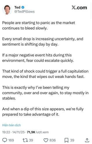 Nhà đầu tư Ted Pillows lưu ý rằng thị trường đang "giảm chậm" (slow bleed), điều này càng khiến mọi người bắt đầu hoảng loạn. Ông cảnh báo rằng trong một môi trường vốn đã mong manh này, chỉ cần một sự kiện tiêu cực lớn xảy ra, nó có thể kích hoạt một đợt hoảng loạn tột độ và dẫn đến động thái "đầu hàng" (capitulation), nhanh chóng loại bỏ những "tay chơi yếu" ra khỏi thị trường.