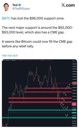 Trong một bản cập nhật trước đó, Pillows đã chỉ ra ngưỡng hỗ trợ quan trọng tiếp theo cho Bitcoin nằm trong khoảng 92.000–93.000 USD. Đáng chú ý, khu vực này cũng trùng với một khoảng trống CME (CME gap) chưa được lấp. Ông dự đoán Bitcoin có thể sẽ giảm xuống để lấp đầy khoảng trống này trước khi có bất kỳ đợt tăng giá phục hồi nào.