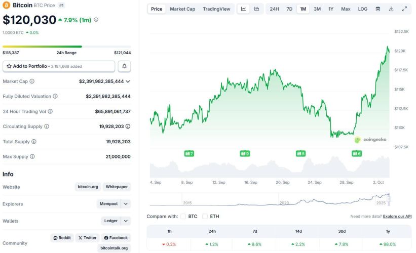 Bước sang quý 4/2025, thị trường tiền mã hóa đã có một màn khởi đầu đầy ấn tượng, nhanh chóng rũ bỏ tâm lý tiêu cực từ đợt điều chỉnh cuối tháng 9. Dữ liệu ghi nhận, giá Bitcoin (BTC) đã thực hiện một cú bứt phá ngoạn mục từ vùng 113.000 USD lên mốc 121.000 USD chỉ trong hai ngày đầu tháng. Đà tăng này đã đưa đồng tiền mã hóa lớn nhất thế giới đến ngưỡng giá trị cao nhất kể từ giữa tháng 8, và chỉ còn cách đỉnh lịch sử (ATH) 124.000 USD khoảng 3%.