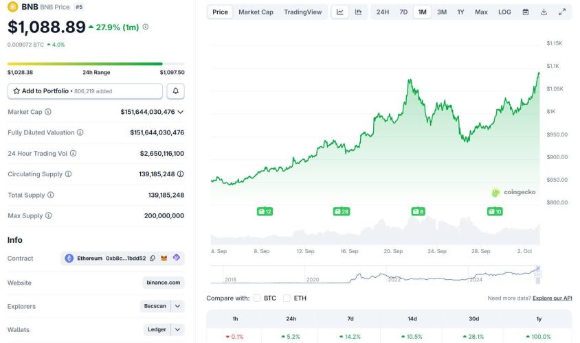 Biến động giá BNB trong 1 tháng gần nhất, ảnh chụp màn hình CoinGecko vào 09:00 AM ngày 03/10/2025