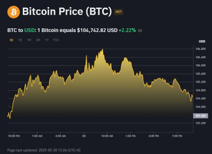 Bitcoin (BTC) hiện đang giao dịch quanh mức $104.559, tăng nhẹ 1,79% trong 24 giờ qua. Trong ngày, BTC đã đạt mức cao nhất là $106.705 và thấp nhất là $102.718.