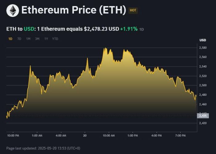 Ethereum (ETH) hiện đang giao dịch ở mức $2.483, tăng khoảng 2,81% trong 24 giờ qua. Trong ngày, ETH đã đạt mức cao nhất là $2.575 và thấp nhất là $2.415.