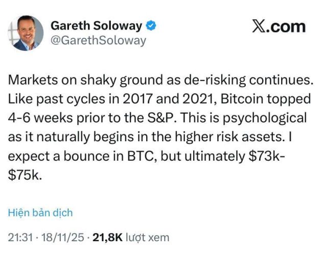 Rào cản lịch sử: Soloway đặc biệt lưu ý đến một đường xu hướng (trendline) dài hạn kéo dài từ thị trường bò (bull run) năm 2017. Trong quá khứ, mỗi khi Bitcoin chạm vào đường này, một đợt bán tháo mạnh lại được kích hoạt. Lần này, kịch bản tương tự đã xảy ra khi BTC mất mốc hỗ trợ quan trọng gần vùng 100.000 USD.