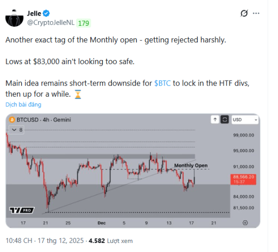 Theo nhận định từ chuyên gia phân tích CryptoJelleNL, cú từ chối giá quyết liệt tại mốc 90.000 USD là một tín hiệu xấu. Chuyên gia này cảnh báo rủi ro BTC có thể tiếp tục điều chỉnh sâu về vùng 83.000 USD hoặc thấp hơn để tìm điểm tựa mới.