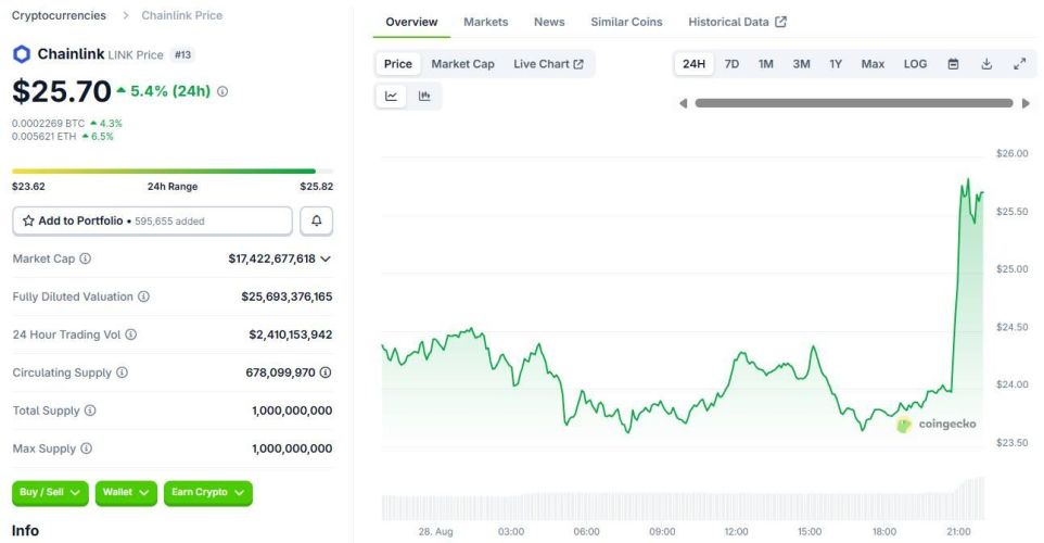Biến động giá LINK trong 24h gần nhất, chụp vào lúc 10:00 PM ngày 28/08/2025 trên CoinGecko