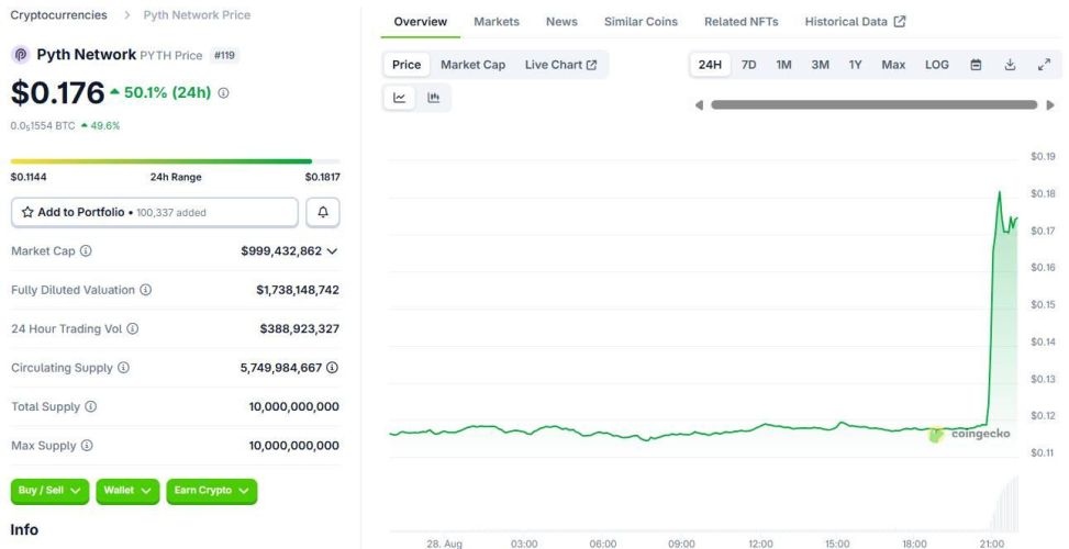 Biến động giá PYTH trong 24h gần nhất, chụp vào lúc 10:00 PM ngày 28/08/2025 trên CoinGecko