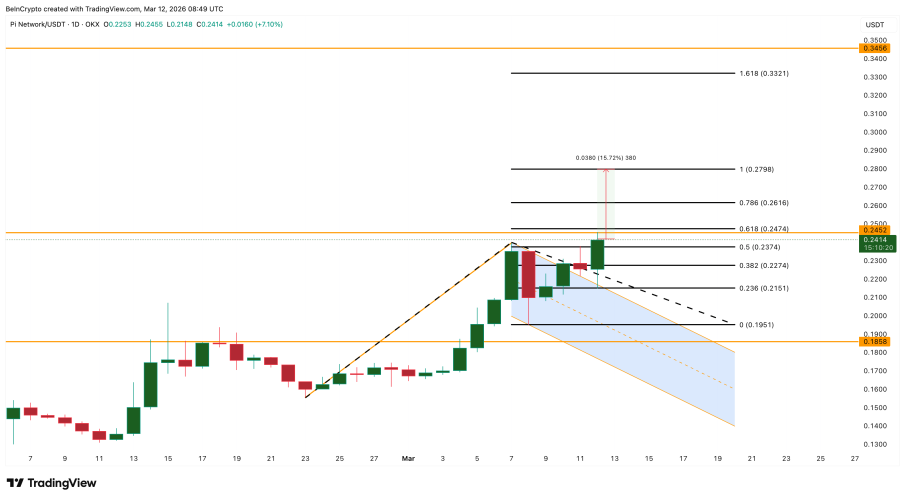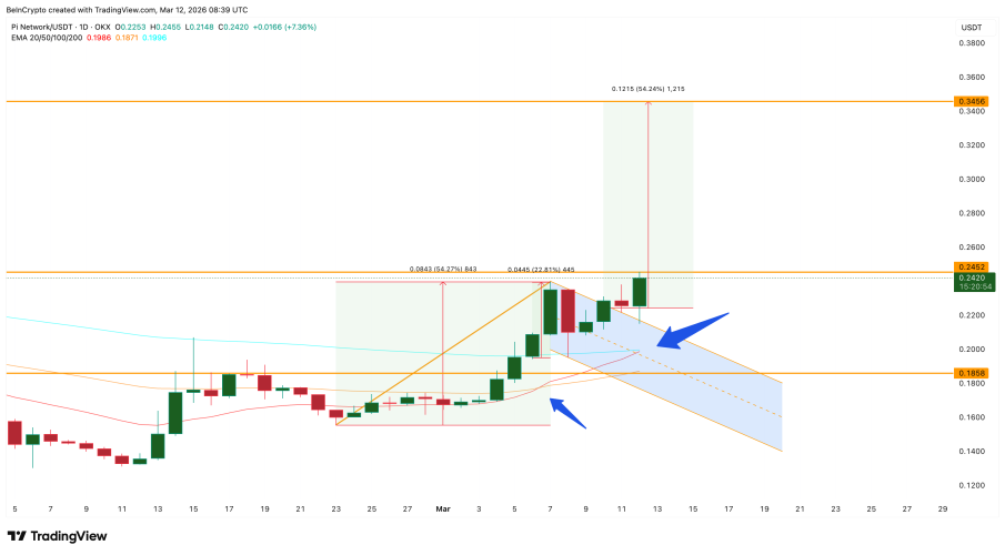 1. Điểm bùng nổ kỹ thuật và hiệu ứng "Golden Cross" Sóng tăng hiện tại của Pi Coin bắt đầu tăng tốc mạnh mẽ khi biểu đồ giá bứt phá khỏi mô hình Cờ Đuôi Nheo (flag-and-pole) vào ngày 10/03. Đây là mô hình kinh điển báo hiệu xu hướng tiếp diễn sau một nhịp nghỉ ngơi ngắn hạn của thị trường. Nhờ lực đẩy này, giá PI đã áp sát mốc 0.245 USD – vùng kháng cự gắt gao nhất thời điểm hiện tại. Đặc biệt, trong ngày cuối cùng trước thềm Nâng cấp Giao thức, phe mua đang dồn toàn lực để xuyên thủng rào cản này.