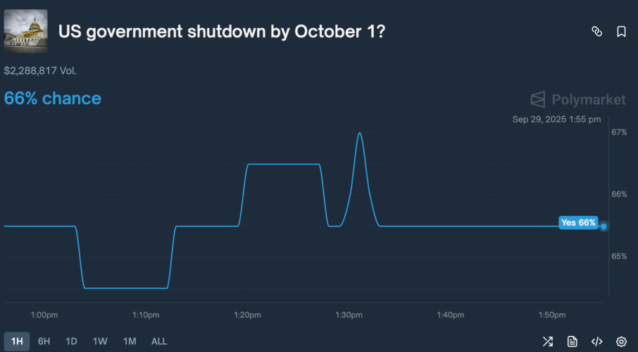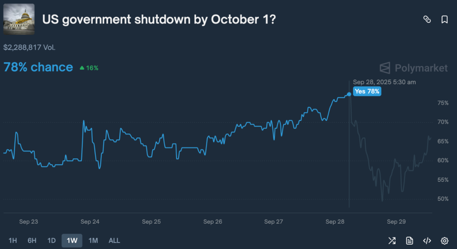 Thị trường tài chính toàn cầu, từ chứng khoán đến tiền điện tử, đang dõi theo sát sao những diễn biến chính trị tại Washington. Hạn chót để Quốc hội Mỹ thông qua ngân sách cho năm tài chính mới đang đến gần, nhưng những bất đồng sâu sắc giữa hai đảng vẫn chưa được giải quyết. Nền tảng dự báo Polymarket hiện đang đưa ra xác suất 66% cho kịch bản chính phủ Mỹ sẽ phải đóng cửa một phần trước ngày 1 tháng 10.