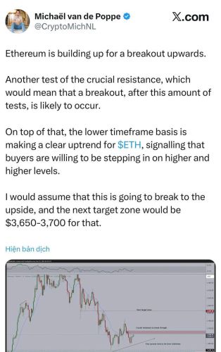 Michael van de Poppe: Nhà giao dịch nổi tiếng này nhận định việc giá liên tục kiểm tra lại mốc 3.200 USD thực chất là tích cực. Theo ông, "nước chảy đá mòn" – việc tấn công liên tục vào một kháng cự cho thấy lực bán đang yếu dần. Nếu phá vỡ thành công, ETH sẽ nhanh chóng tiến tới vùng 3.650 – 3.700 USD.