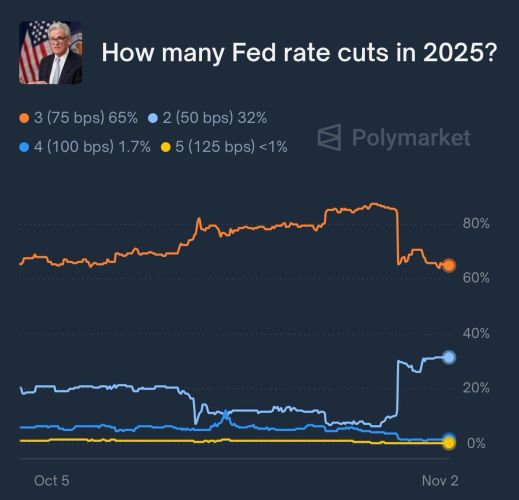 Sự không chắc chắn này được phản ánh qua thị trường dự đoán. Dữ liệu từ Polymarket cho thấy xác suất Fed cắt giảm lãi suất lần thứ ba trong năm 2025 đã giảm từ 90% xuống còn 65%. Điều này chỉ ra rằng thị trường đang phải định giá lại kỳ vọng. Nếu Fed không thể đáp ứng mong đợi nới lỏng này, một đợt suy thoái mạnh có thể xảy ra khi dòng vốn tháo chạy khỏi các tài sản rủi ro.