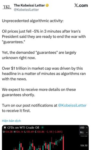 Tờ Kobeissi Letter ghi nhận một hiện tượng hiếm thấy: Giá dầu sụt giảm 5% chỉ trong vỏn vẹn 3 phút. Phản ứng dây chuyền này cho thấy sức mạnh của thông tin vĩ mô khi hơn 1.000 tỷ USD giá trị thị trường đã được luân chuyển, tái phân bổ lại danh mục đầu tư trên toàn cầu.