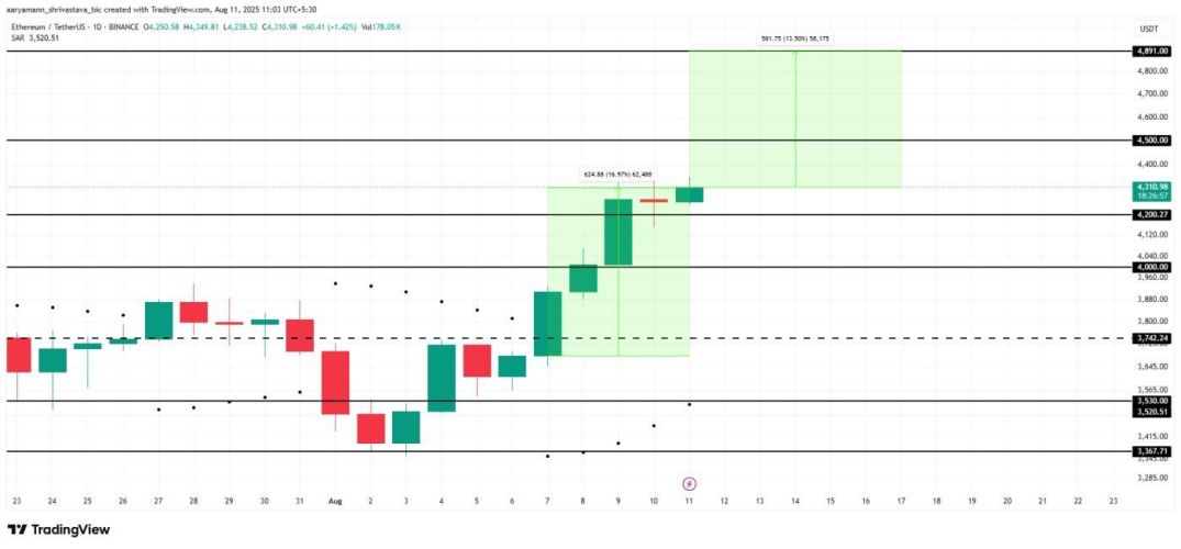 Tình hình hiện tại: "Gã khổng lồ" Ethereum đang có một tháng 8 rực rỡ, giao dịch tại $4,303 - mức cao nhất trong vòng 3.5 năm qua. Việc altcoin này vượt qua cột mốc $4,000 vào cuối tuần trước đã mở đường cho mục tiêu tiếp theo: đỉnh lịch sử $4,891.