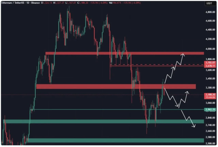 Không chỉ Bitcoin, Ethereum cũng đang đứng trước thời khắc quyết định vận mệnh. Sau khi bị từ chối tại ngưỡng 3.400 USD và thoái lui về vùng hỗ trợ 3.000 – 3.100 USD, ETH đang nén lại để chờ bùng nổ.