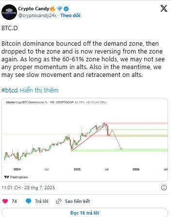 Mặc dù các tín hiệu đang rất lạc quan, con đường đến Mùa Altcoin không phải lúc nào cũng trải đầy hoa hồng. Một số nhà phân tích vẫn giữ thái độ thận trọng, và họ có lý do của mình. BTC.D hiện đang dao động tại vùng nhu cầu 60–61%. Đây được xem là một ngưỡng hỗ trợ tâm lý và kỹ thuật cực kỳ mạnh. Trong quá khứ, mỗi khi BTC.D chạm đến vùng này, nó thường bật tăng trở lại, dập tắt hy vọng của các altcoin. Nhà phân tích Crypto Candy nhận định: “Trừ khi BTC.D phá vỡ vùng này một cách dứt khoát, altcoin nhiều khả năng sẽ tiếp tục gặp khó khăn. Chừng nào vùng 60–61% còn được giữ vững như một lá chắn phòng thủ, động lực bứt phá ở altcoin sẽ chưa hình thành.” Điều này có nghĩa là thị trường có thể sẽ tiếp tục "giằng co" trong thời gian tới. Các altcoin có thể vận động chậm chạp và đối mặt với những nhịp điều chỉnh bất ngờ trước khi có một cú bứt phá thực sự.