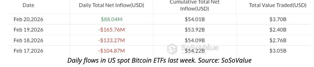 Dù bức tranh chung khá ảm đạm, các quỹ Bitcoin ETF giao ngay tại Mỹ vẫn nhen nhóm hy vọng về sự phục hồi. Dữ liệu từ SoSoValue cho thấy khối lượng giao dịch đã tăng vọt từ 2,4 tỷ USD lên 3,7 tỷ USD vào phiên cuối tuần trước. Dù cả tuần vẫn âm 315,9 triệu USD, nhưng việc ghi nhận 88 triệu USD tiền vào trong ngày thứ Sáu cho thấy lực cầu bắt đáy đang dần xuất hiện.