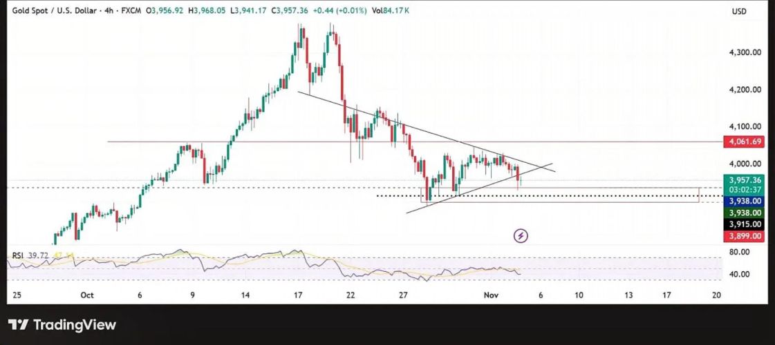 Về mặt kỹ thuật, giá vàng đã phá vỡ cạnh dưới của mô hình tam giác đối xứng, một tín hiệu thường báo hiệu xu hướng giảm giá. Hiện tại, XAU đang được giao dịch tại một điểm mấu chốt (quanh 3.938 USD). Nếu mức hỗ trợ này bị phá vỡ với một cây nến 4 giờ đóng cửa dưới 3.915 USD, các nhà phân tích dự báo một đợt bán tháo tiếp diễn, đẩy kim loại quý này về kiểm tra các vùng thanh khoản thấp hơn (quanh 3.899 USD hoặc thấp hơn).