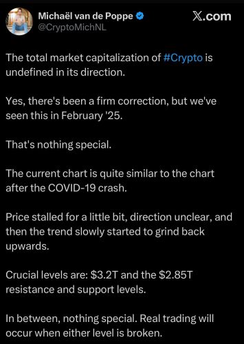 Đánh giá về triển vọng kỹ thuật, nhà phân tích thị trường Michaël van de Poppe cho rằng dù có sự điều chỉnh, xu hướng dài hạn vẫn chưa bị phá vỡ hoàn toàn. Ông so sánh nhịp điều chỉnh hiện tại với các biến động đã diễn ra hồi đầu năm 2025 – giai đoạn thị trường cần những nhịp "nghỉ" để rũ bỏ các nhà đầu tư yếu tâm lý trước khi tích lũy cho đà tăng mới.