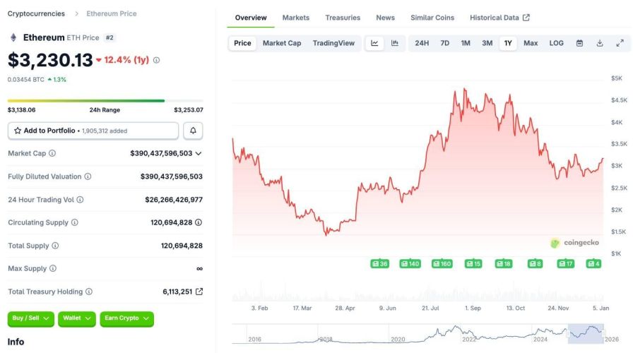 Tuyên bố của Vitalik Buterin đến vào thời điểm thị trường đang tìm kiếm động lực tăng trưởng mới. Tính đến ngày 7/1/2026, giá Ethereum (ETH) đang giao dịch quanh mức 3.230 USD. Mặc dù con số này vẫn thấp hơn khoảng 35% so với mức đỉnh lịch sử 4.956 USD thiết lập vào tháng 8/2025, nhưng tâm lý nhà đầu tư đã bớt bi quan hơn.