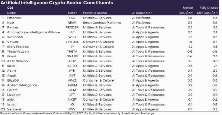 Vào năm 2023, tổng vốn hóa của các token AI chỉ khoảng 4,5 tỷ USD – một con số khiêm tốn trong một thị trường trị giá hàng nghìn tỷ. Nhưng đến thời điểm hiện tại, con số này đã tăng gấp bốn, đạt gần 20 tỷ USD, dù vẫn chỉ chiếm 0,67% tổng giá trị toàn thị trường tiền điện tử. Để dễ hình dung, lĩnh vực tài chính trên blockchain – bao gồm các dự án như stablecoin, lending, DeFi – đang nắm giữ vốn hóa lên đến 519 tỷ USD. So sánh này cho thấy lĩnh vực AI crypto vẫn còn rất nhiều "room" để tăng trưởng – giống như những gì DeFi từng trải qua vào năm 2020. Theo Grayscale, quỹ đầu tư tài sản kỹ thuật số hàng đầu thế giới, sự "nhỏ bé" này không phải là điểm yếu – mà là dấu hiệu cho thấy lĩnh vực đang ở giai đoạn sơ khai với dư địa tăng trưởng khổng lồ.