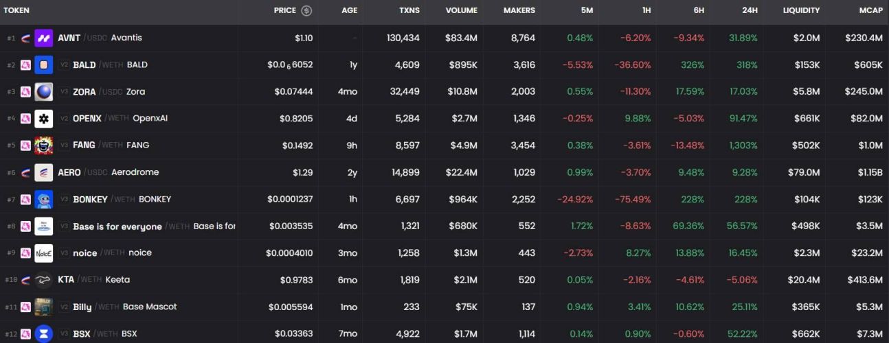 Biến động giá các token được giao dịch nhiều trên Base, ảnh chụp màn hình DEX Screener vào 10:40 PM ngày 15/09/2025
