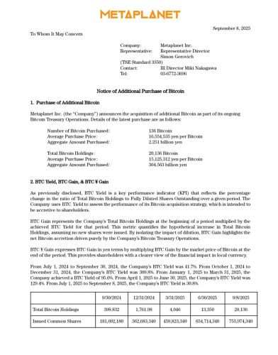 Trong một thông báo phát đi vào ngày thứ Hai, Metaplanet Inc. (TYO:3350), một công ty trong lĩnh vực khách sạn tại Nhật Bản, cho biết đã hoàn tất việc mua thêm 136 Bitcoin với tổng giá trị khoảng 15,2 triệu USD. Giao dịch này, được thực hiện ở mức giá trung bình 111.783 USD mỗi đồng, đã nâng tổng số Bitcoin mà công ty nắm giữ lên 20.136 BTC.
