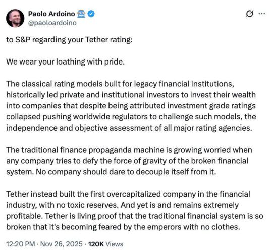 Không chỉ dừng lại ở rủi ro thị trường, S&P còn chỉ trích gay gắt về tính minh bạch trong vận hành của Tether. Dù Tether tuyên bố phần lớn dự trữ được đầu tư vào trái phiếu Kho bạc Mỹ ngắn hạn và các khoản tương đương tiền mặt, nhưng S&P cho rằng thông tin được cung cấp vẫn quá hạn chế.