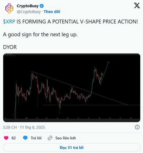Mô hình chữ V (V-shaped recovery): Sau một đợt giảm, giá XRP đang có dấu hiệu phục hồi mạnh mẽ theo hình chữ V. Đây là một trong những tín hiệu đảo chiều tăng giá mạnh mẽ nhất, cho thấy phe mua đã hoàn toàn áp đảo phe bán và sẵn sàng đẩy giá lên các tầm cao mới.