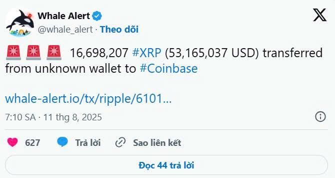 Thị trường tiền điện tử, vốn không bao giờ ngủ, lại một lần nữa dậy sóng. Giữa màn đêm tĩnh lặng của các biểu đồ giá, một tín hiệu khẩn cấp đã được phát đi từ Whale Alert - công cụ theo dõi các giao dịch blockchain hàng đầu. Một lượng XRP khổng lồ, với giá trị lên tới 53,16 triệu USD, đã bất ngờ được di chuyển. Đích đến? Sàn giao dịch Coinbase, một trong những "chiến trường" thanh khoản bậc nhất thế giới crypto.