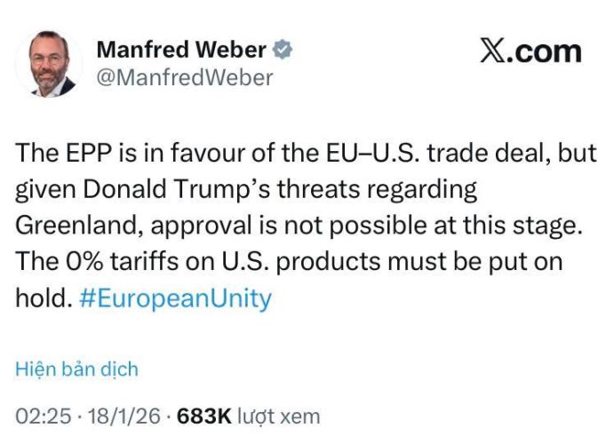 Trên mạng xã hội hôm thứ Bảy, ông Weber tuyên bố thẳng thắn rằng dù EPP về nguyên tắc ủng hộ tự do thương mại, nhưng việc phê chuẩn thỏa thuận trong bối cảnh hiện tại là "nhiệm vụ bất khả thi". Ông nhấn mạnh rằng các cam kết cắt giảm thuế quan của EU đối với hàng hóa Mỹ cần phải bị tạm dừng ngay lập tức trước những lời đe dọa liên quan đến Greenland từ phía Nhà Trắng.
