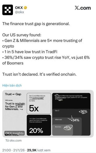 Cuộc khảo sát mới nhất từ OKX hé lộ một cuộc "đổi ngôi" ngoạn mục trong năm 2026: Gen Z đang trỗi dậy mạnh mẽ để trở thành thế hệ dẫn dắt thị trường tiền mã hóa. Trong khi giới trẻ hào hứng tìm kiếm tự do tài chính mới, thế hệ Baby Boomer vẫn kiên định bám trụ với "thành trì" ngân hàng, tạo nên một bức tranh tương phản đầy thú vị về tương lai của tiền tệ.