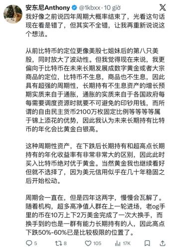 Trái ngược với sự thận trọng ngắn hạn, Anthony (Nhà sáng lập 1kBCapital) giữ vững niềm tin vào chu kỳ dài hạn của BTC. Ông cho rằng mức giảm 50-60% từ đỉnh là giới hạn tối đa cho các đợt điều chỉnh. Theo ông, nắm giữ Bitcoin dài hạn mang lại tỷ suất sinh lời vượt trội so với vàng. Lời khuyên của Anthony là: Hãy kiên nhẫn xây dựng vị thế (gom hàng) dần dần mỗi khi giá điều chỉnh sâu.
