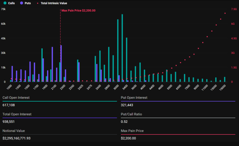 ETH: Max Pain ở mức 2.200 USD, tỷ lệ put-to-call là 0,52