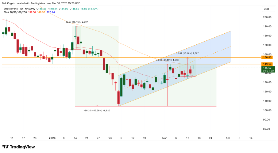 Bức tranh kỹ thuật của MSTR đang cho thấy những dấu hiệu chuyển mình rõ rệt. Sau cú trượt dài 45% từ đỉnh tháng 1, cổ phiếu này đã tìm thấy điểm cân bằng vào đầu tháng 2 và bật tăng 43%, thiết lập một kênh giá hướng lên vững chãi.