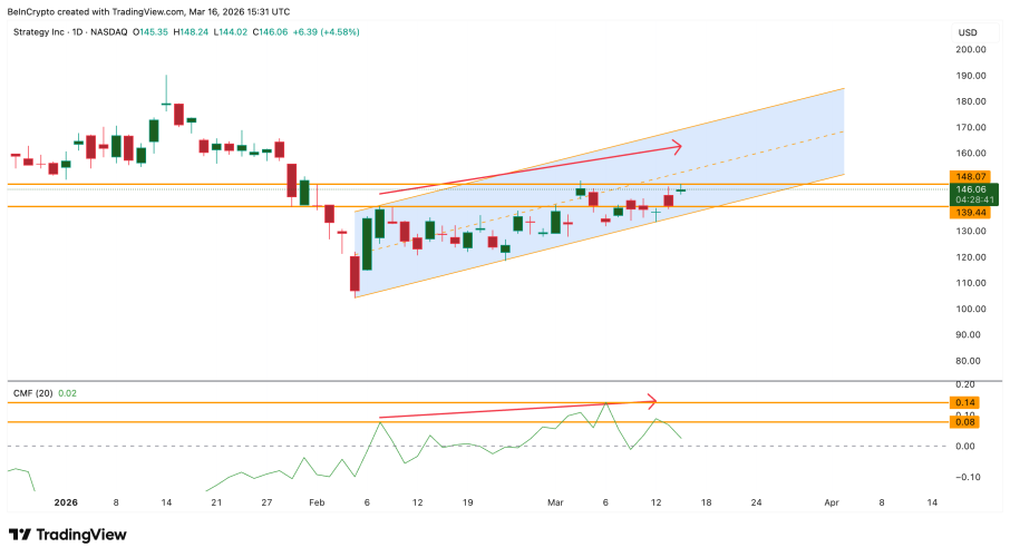 Sức nóng của MicroStrategy không chỉ thể hiện trên biểu đồ giá mà còn được xác nhận bởi các chỉ báo dòng tiền. Chỉ báo Chaikin Money Flow (CMF) – thước đo dòng tiền lớn ra vào cổ phiếu – đã liên tục nhích lên từ đầu tháng 2. Nếu CMF có thể chạm mốc 0.14, đó sẽ là lời khẳng định đanh thép rằng dòng tiền đang cuồn cuộn đổ vào, tạo bệ phóng vững chắc cho MSTR tiến lên những đỉnh cao mới.