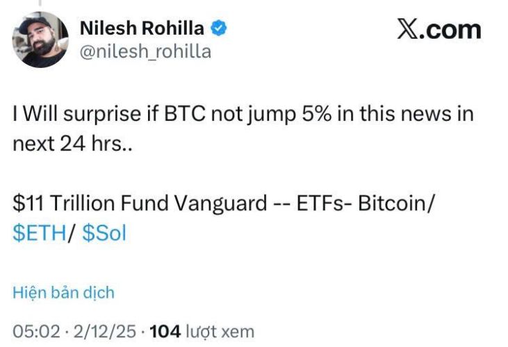 Nhà phân tích Nilesh Rohilla nhận định ông sẽ rất ngạc nhiên nếu Bitcoin không tăng ít nhất 5% trong 24 giờ tới sau tin tức này.