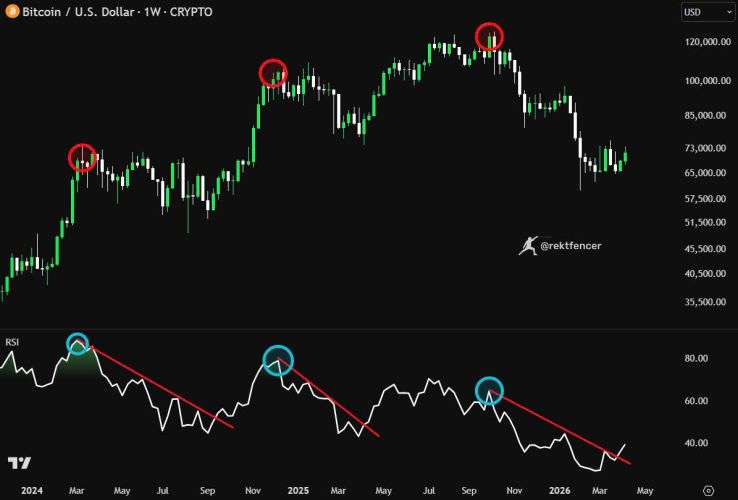 Tín hiệu lạc quan từ RSI: Nhà giao dịch Rekt Fencer chỉ ra rằng việc chỉ số RSI hàng tuần bứt phá khỏi xu hướng giảm thường là dấu hiệu cho thấy thị trường gấu đã thực sự kết thúc.
