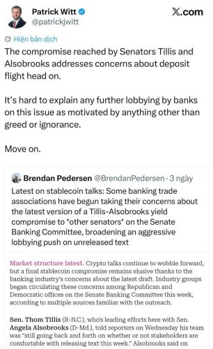 Phản ứng trước động thái can thiệp từ phe ngân hàng, Patrick Witt – Giám đốc điều hành Hội đồng Crypto Nhà Trắng – đã không ngần ngại chỉ trích gay gắt trên nền tảng X. Ông thẳng thừng nhận định rằng những nỗ lực cản trở liên tục này không thể được lý giải bằng lý do nào khác ngoài "động cơ trục lợi hoặc sự thiếu hiểu biết" về bản chất của công nghệ.