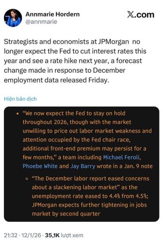 Thị trường vừa nhận một tin không mấy vui vẻ: JPMorgan Chase đã chính thức gạch bỏ kỳ vọng về việc Fed sẽ cắt giảm lãi suất trong năm 2026. Thay vào đó, ngân hàng này đưa ra một kịch bản trái ngược hoàn toàn: Fed sẽ tăng lãi suất thêm 25 điểm cơ bản vào quý 3 năm 2027.