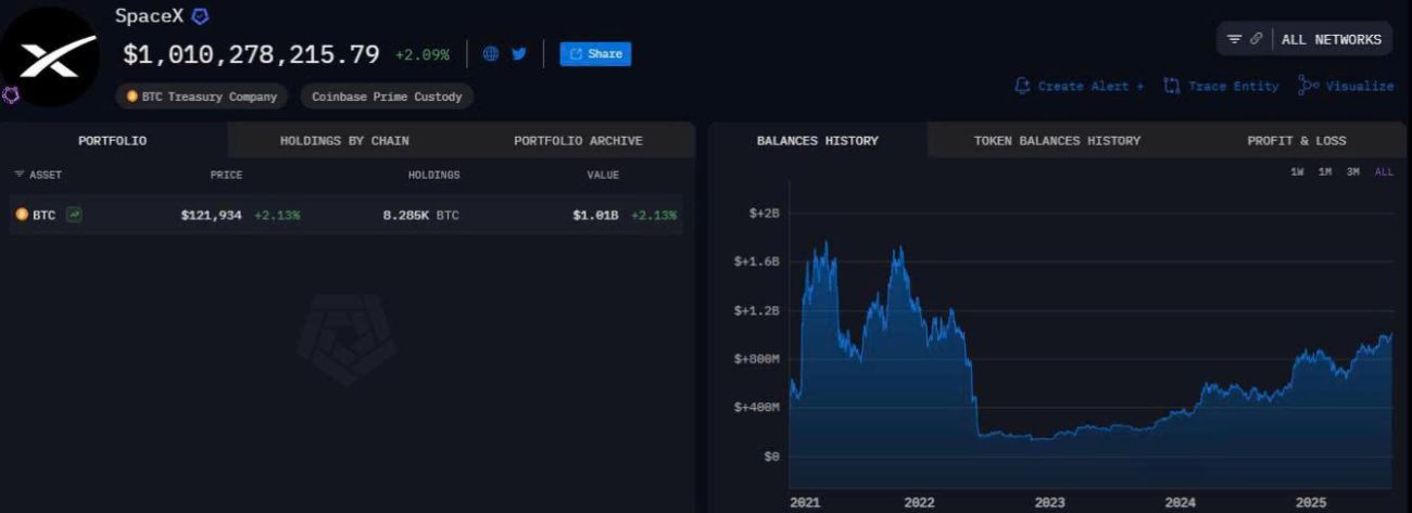Theo dữ liệu mới nhất từ nền tảng phân tích on-chain Arkham Intelligence, gã khổng lồ hàng không vũ trụ SpaceX hiện đang nắm giữ 8.285 BTC, với tổng giá trị ước tính lên đến 1.02 tỷ USD. Con số này ngay lập tức đưa SpaceX trở thành công ty tư nhân lớn thứ tư trên thế giới về lượng Bitcoin nắm giữ. Tuy nhiên, đây không phải là lần đầu tiên công ty của Musk đạt được cột mốc ấn tượng này.