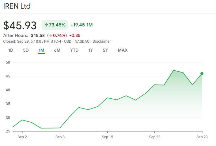 Giá cổ phiếu IREN trong tháng qua. Nguồn: Google Finance