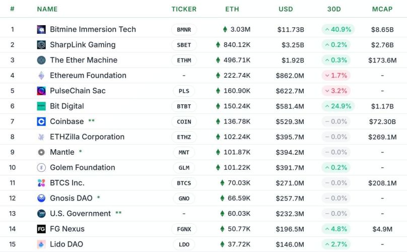 Thống kê các tổ chức đang nắm giữ nhiều ETH nhất. Nguồn: Strategic ETH Reserve (18/10/2025)