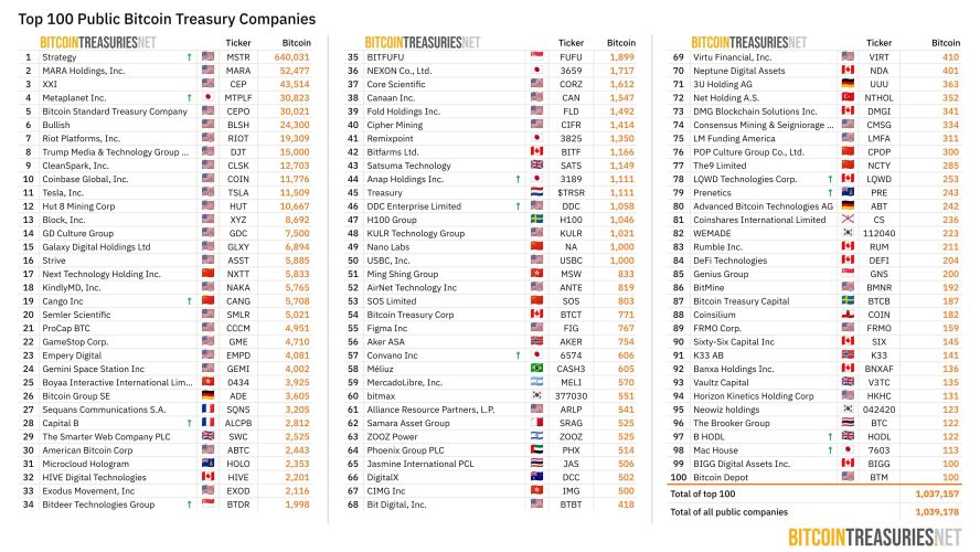 Danh sách 100 công ty niêm yết sở hữu nhiều Bitcoin toàn cầu. Nguồn: Bitcoin Treasuries (01/10/2025)