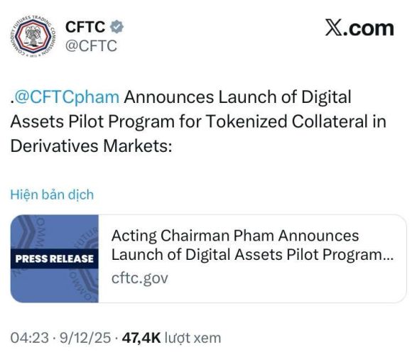 Cộng đồng tài chính và tiền điện tử vừa chứng kiến một cột mốc lịch sử khi Ủy ban Giao dịch Hàng hóa Tương lai Hoa Kỳ (CFTC) chính thức triển khai chương trình thí điểm tài sản kỹ thuật số. Theo đó, các loại tiền mã hóa hàng đầu gồm Bitcoin (BTC), Ether (ETH) và USDC giờ đây được chấp nhận làm tài sản thế chấp ký quỹ trên thị trường phái sinh.