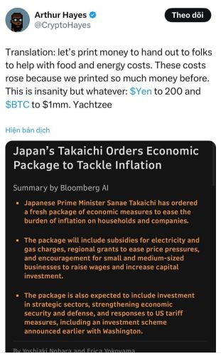 Từ góc nhìn thị trường crypto, Arthur Hayes, nhà đồng sáng lập BitMEX, đã có những nhận định táo bạo. Ông cho rằng sự phát triển này là tín hiệu cho thấy Ngân hàng Trung ương Nhật Bản (BOJ) sẽ buộc phải tiếp tục "in tiền" (fiat), và chính hành động này có thể châm ngòi cho đợt tăng giá bùng nổ của Bitcoin lên mức không tưởng 1 triệu đô la.