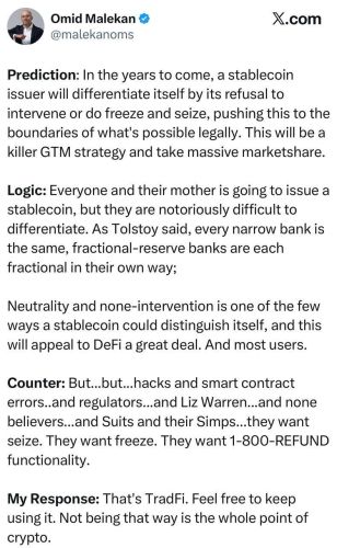 Mọi chuyện bắt nguồn từ một câu hỏi đầy thách thức của giáo sư Omid Malekan (Trường Kinh doanh Columbia) trên nền tảng X: Sẽ ra sao nếu có một stablecoin khước từ mọi quyền phong tỏa tài sản của người dùng?
