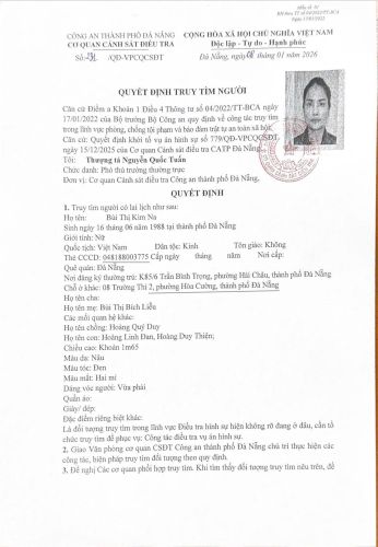 Để đảm bảo tính nghiêm minh của pháp luật và thu hồi tài sản cho các nạn nhân, Cơ quan Cảnh sát điều tra Công an TP. Đà Nẵng đề nghị công an các đơn vị, địa phương cùng phối hợp rà soát, truy tìm Bùi Thị Kim Na.